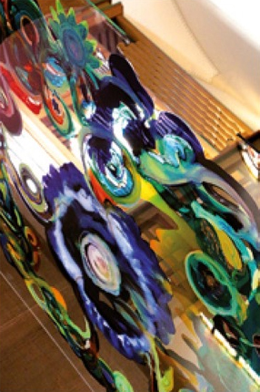 Ihre Glasarbeiten verdienen eine ganz besondere Beachtung: Noch bis zum Ende Dezember 2016 läuft in ihrer eigenen Galerie eine Ausstellung, wo sie ihre Glaskunstwerke dem Publikum präsentiert. Alle hier besprochenen Werke sind in ihrer Galerie dort aktuell zu erleben: So die von der Künstlerin kreierte, bemalte Acrylwürfelskulptur "Harmonie", bestehend aus sechs Glas-Elementen zu je 2 x 2 Metern. Verschiedene Motive wie "Im ewigen Kreis - Grasland - Feuer - Wasser - Erde - Luft" zieren diese einzelnen Platten, die mit Glasfarbe gestaltet wurden. Und so unterschiedlich diese Arbeiten als Einzelwerke thematisch sich auch darstellen: Gemeinsam ist ihnen eine farbliche Unbeschwertheit, eine Frische, die sich voll fließender Energie auf dem Material organisch zu verteilen scheint, wie beispielsweise die gelungene Darstellung einer Bewegung von Wasserpflanzen.