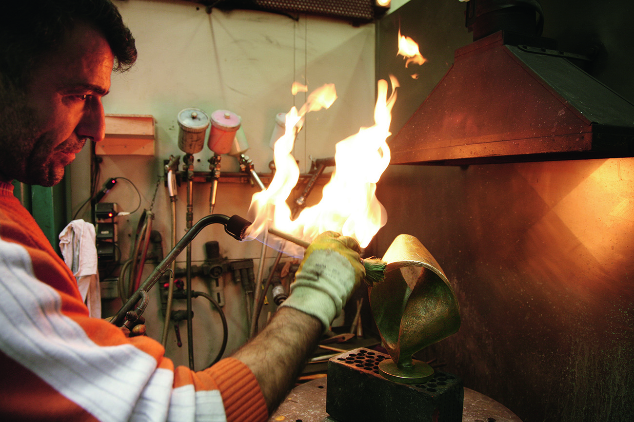 Das Patinieren ist der letzte Hauptbearbeitungsschritt. Hier kommen Patinierlösungen zum Einsatz, die nach alten überlieferten Rezepturen hergestellt werden. Das Kunstobjekt wird zunächst für einen genau festgelegten Zeitraum in ein Patinabad getaucht. Anschließend werden in Handarbeit weitere Patinierlösungen aufgetragen und mit der Gasflamme eingebrannt. So erhält jedes Bronzeobjekt seine charakteristische Ausstrahlung. Jedes Kunstobjekt unterscheidet sich durch geringe Patinierungsnuancen. Die Bronze wird nun gründlich gewaschen und gewachst. Das Kunstwerk ist vollendet – geschaffen für die Ewigkeit.