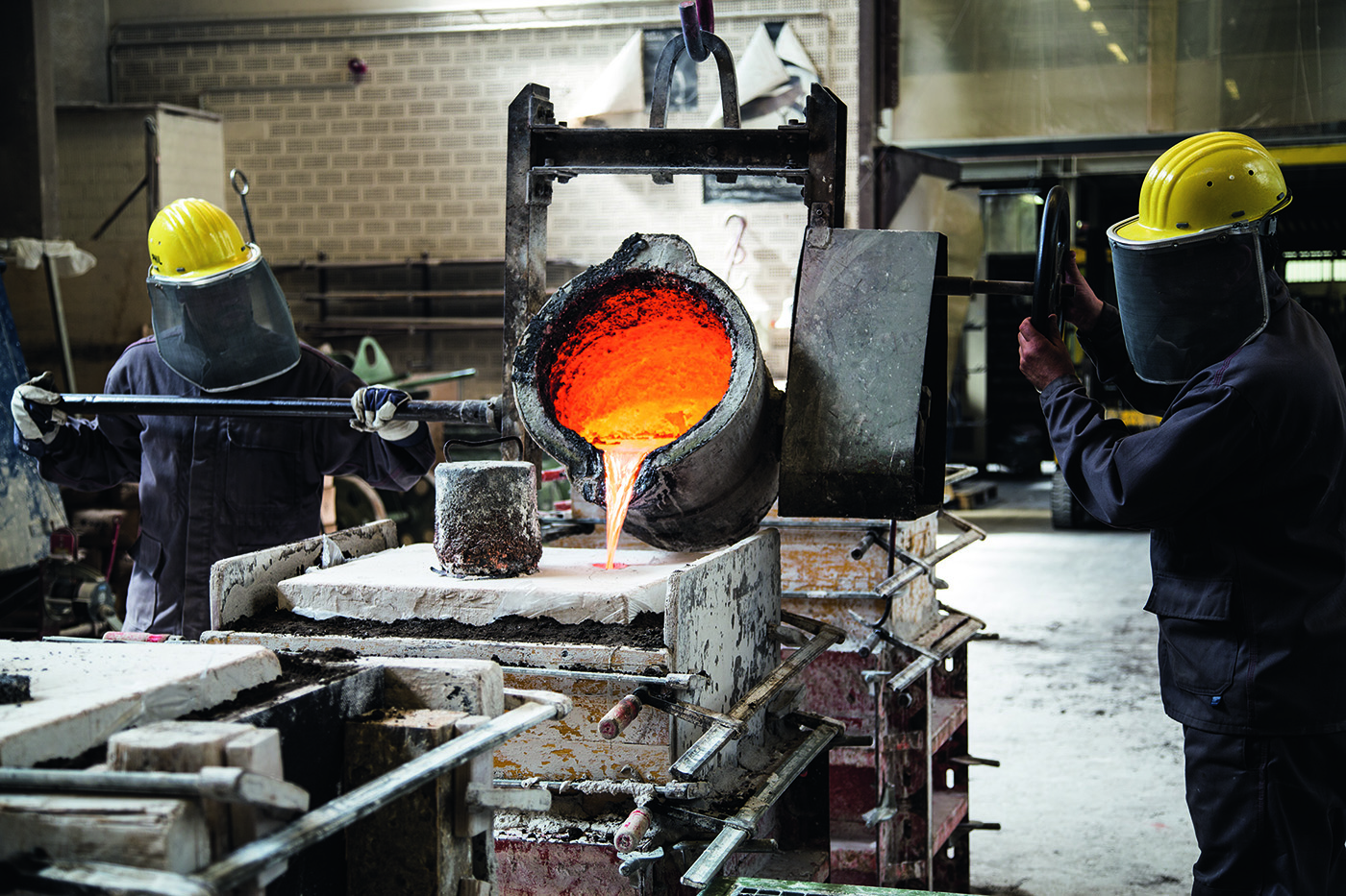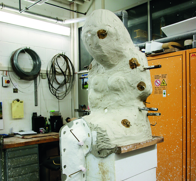 Die originalgetreue Negativform ist nun fertig. Die beiden Formhälften werden zusammengeführt und mit heißem Wachs ausgegossen. Nach einigen Minuten des Erkaltens entsteht eine Wachsschicht. Dieser Wachs-rohling wird vom Künstler nochmals retuschiert und mit Gusskanälen versehen. Danach wird das Wachsmodell mit Schamotte umhüllt und bei 600 Grad im Ofen ca. sieben Tage ausgebrannt. So kann das Wachs aus-schmelzen, und der Hohlraum wird ausgetrocknet. Nun kommt der alles entscheidende Augenblick des Gießens: Die im Tiegelofen auf ca. 1.250 Grad erhitzte flüssige Bronze wird in die ausgebrannte Form ge-gossen. Die flüssige Bronze bahnt sich ihren Weg in die vom Wachs hinterlassenen Hohlräume. Die Bronze kann langsam erkalten und nach drei bis vier Tagen wird der Schamotteman-tel abgeschlagen.