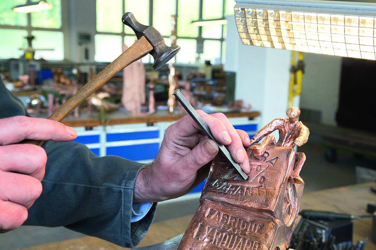 Der Rohling wird zunächst gereinigt und seine Oberflächenqualität beurteilt. Nachdem der Ziseleur Einguss- und Abluftkanäle abgetrennt und mehrteilig gegossene Skulpturen zusammengeschweißt hat, geht er mit großer Virtuosität daran, die Oberflächen mit Punzen oder Meißel, mit Feile, Schleif- und Polier-werkzeugen nachzuarbeiten. Jedes noch so feine Detail wird in konzentrierter Handarbeit gefühlvoll heraus-gearbeitet und die Besonderheiten des Objekts werden betont. Das Ergebnis ist ein lebendiges ausdrucks-starkes Kunstwerk, das dem Originalmodell des Künstlers exakt entspricht.